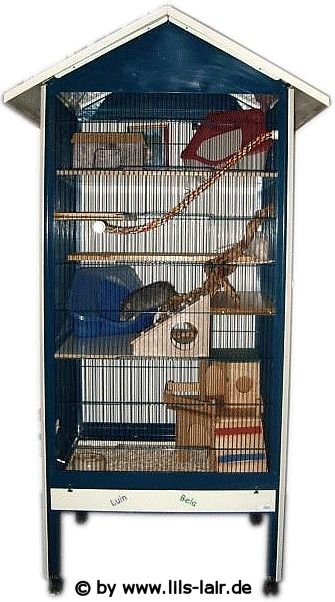 Die wohl gängigste Behausung ist ein Gitterkäfig aus dem Zoohandel.