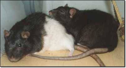 Ikarus und Pegasus kamen im Alter von ca. sechs Monaten zu uns. Wir bekamen sie aus der Notfallstation des Rattenhilfe e.V. Den weiten Weg von dort legten sie mit Heiko im Zug zurück. Leider war es gerade an diesem Tag besonders heiß, und so waren sie völlig fertig, als sie am Abend endlich bei uns ankamen. Wir versorgten die beiden also erst mal mit Wasser und Futter und ließen sie in Ruhe, damit sie sich etwas erholen konnten. Schon bald konnten wir sie unseren Mädchen vorstellen und mit der Integration beginnen. Inzwischen leben die Vier in unserer großen Ratzenburg, als hätten sie sich schon immer gekannt und es macht Spaß, sie beim gemeinsamen toben und kuscheln zu beobachten. Ikarus ist ein wenig schüchtern und schreckhaft, lässt sich aber geduldig durchknuddeln. Das Klettern liegt ihm nicht besonders, er kuschelt lieber mit "seinem" Tischbein oder döst im Häuschen. Ikarus ist eben ein Gemütsratz. Pegasus dagegen ist viel zu neugierig um lange still zu halten und muss alles erkunden. Aber wenn man ihn von den anderen trennt, um auf dem Sofa mit ihm zu kuscheln, wird er zum Schmuseratz, lässt sich stundenlang kraulen und genießt mit geschlossenen Augen. Im Klettern versucht er immer Nikita und Jazzy nachzueifern, aber er ist einfach nicht so schnell und geschickt. Kein Wunder, er wiegt ja auch einiges mehr. Außerdem ist er unübersehbar der Herrscher in seinem Revier, das er von seinem Lieblingsplatz aus regiert - der Röhre.